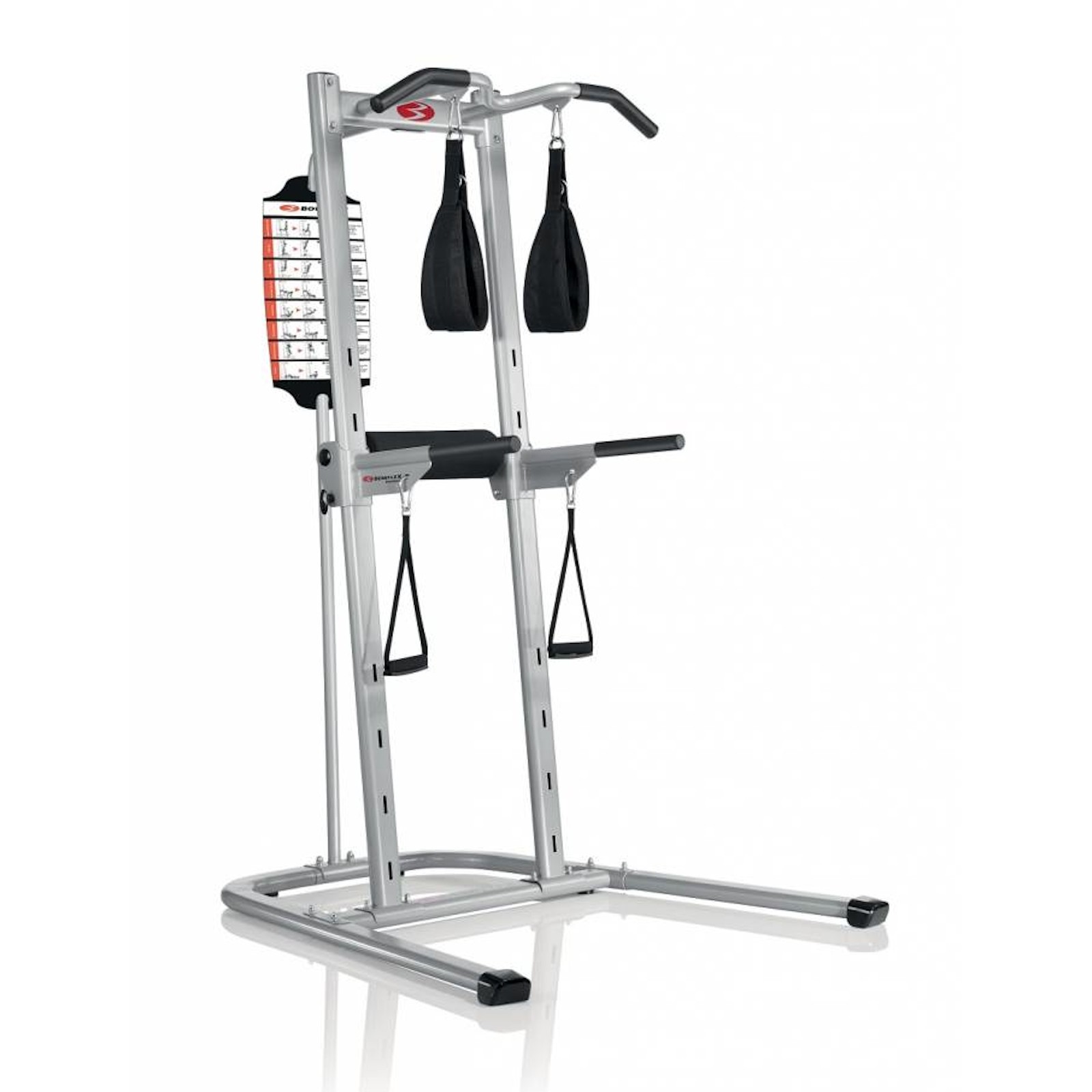 La Chaise romaine Bowflex Body Tower offre une grande polyvalence dans les exercices réalisables à domicile. La chaise romaine est une station avec laquelle tout le haut du corps peut être entraîné efficacement. Vous pouvez développer votre dos avec les barres de tractions, grâce aux sangles à abdominaux venir renforcer votre sangle abdominale, et travailler vos bras et vos pectoraux avec des pompes.Chaise romaine Bowflex Body Tower : avec startion à dips réglable en hauteur