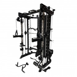 - Alles in einer Station: Smith-Maschine, verstellbare Kabelzüge, Klimmzugstange, Dip-Griffe, Landmine-Aufsatz sowie Spotter Arme für optionales Langhanteltraining